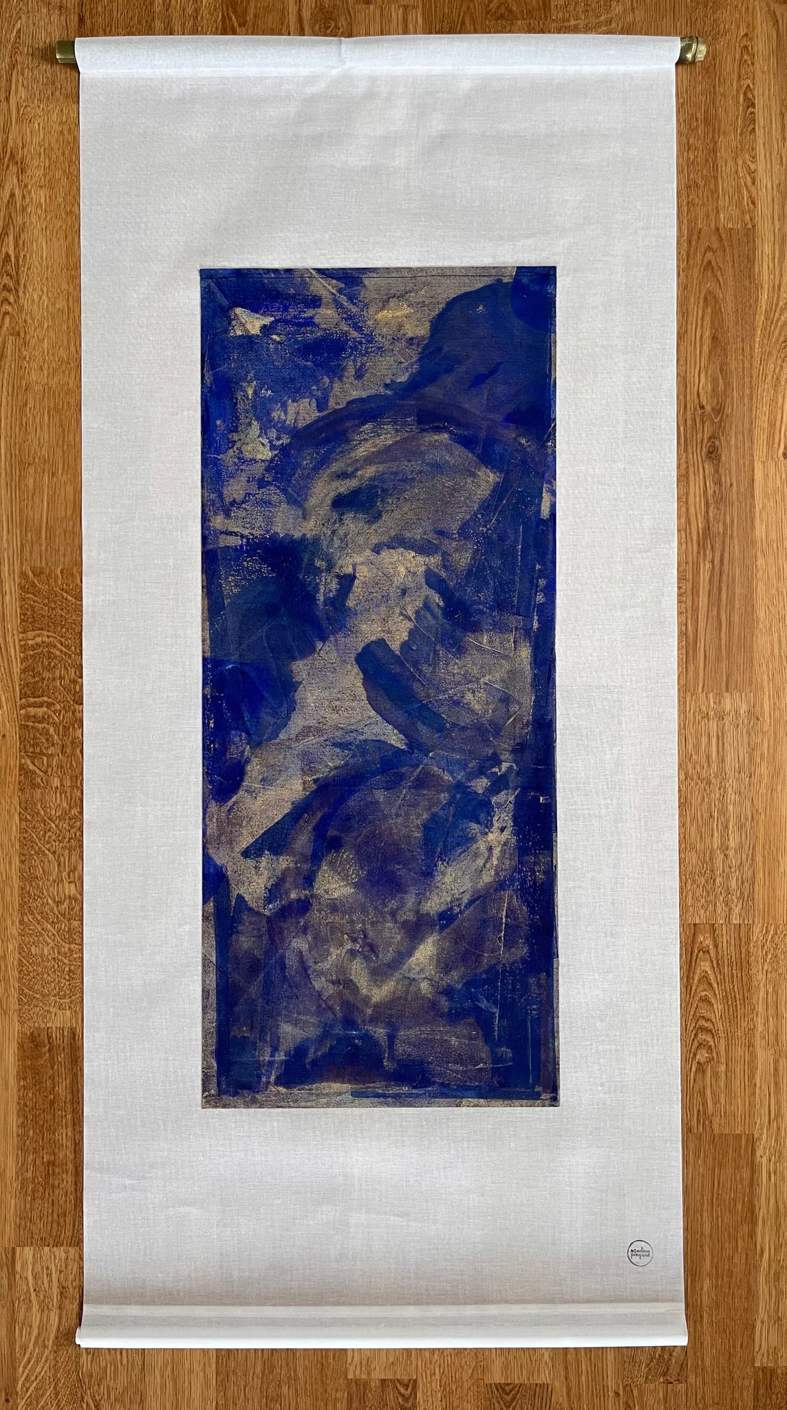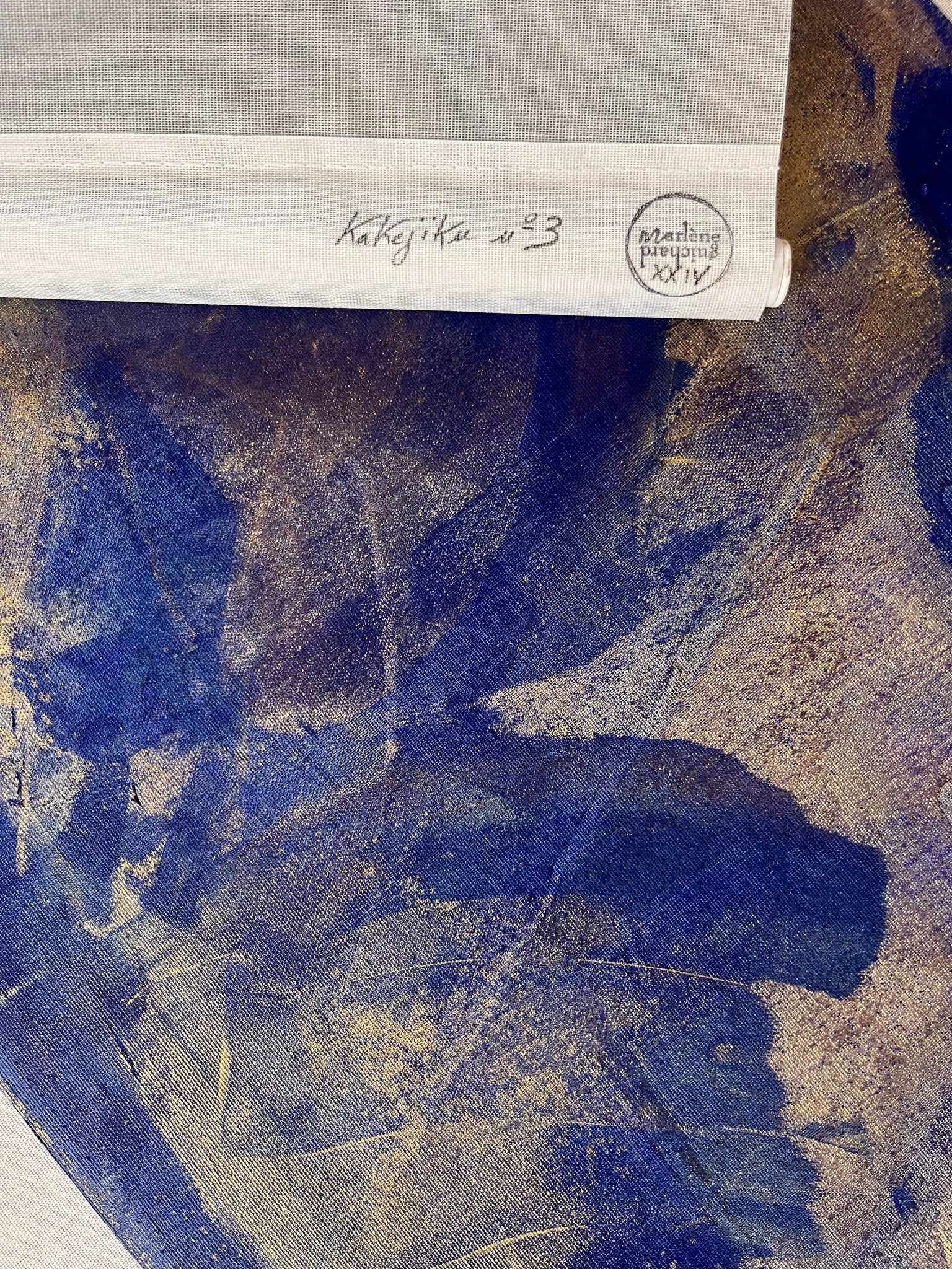 Créés à l'occasion d'une installation à la 16e Biennale des Serres de la Tuilerie en 2024, en Centre-Val de Loire (France), cette collection de kakejikus est un travail sur le geste pictural dans la superposition des couleurs bleu outremer et or pâle.